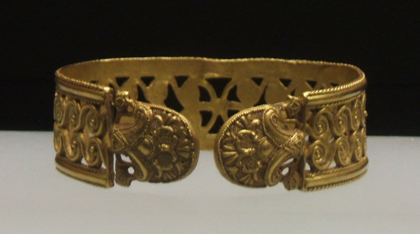 Tesoro de El Carambolo, Museo Arqueológico de Sevilla. Foto: © José Luiz Bernardes Ribeiro. CC BY-SA 3.0. Original file (2,048 × 1,360 pixels, file size: 951 KB). Ajuar áureo del Tesoro del Carambolo (siglos VII–VI a. C.), hallado en Camas (Sevilla). Se compone de collares, brazaletes, placas y un pectoral, y representa una de las expresiones más sobresalientes de la orfebrería tartésica, con claras influencias fenicias.