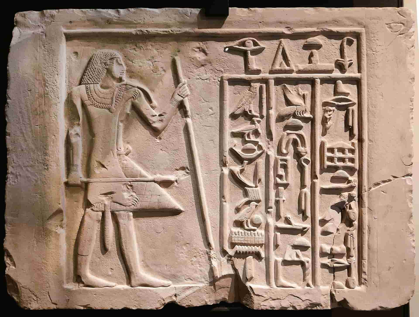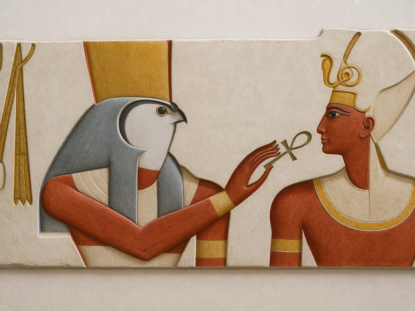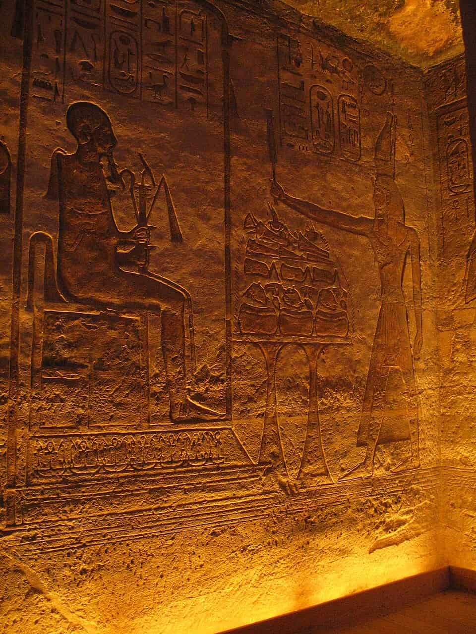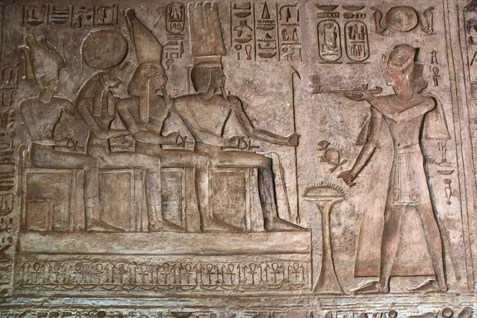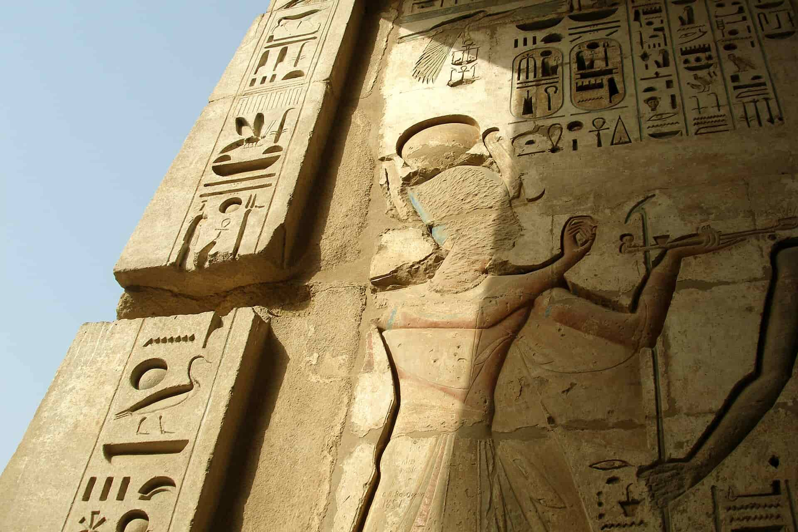 En la escena aparece una figura divina esculpida en alto relieve, acompañada de jeroglíficos grabados sobre la piedra. La calidad del trabajo revela el alto nivel técnico alcanzado por los artesanos egipcios, capaces de combinar arquitectura, escultura y escritura en una misma superficie cargada de significado. Nada era puramente decorativo: cada símbolo, cada gesto y cada inscripción participaban de una visión ordenada del mundo.