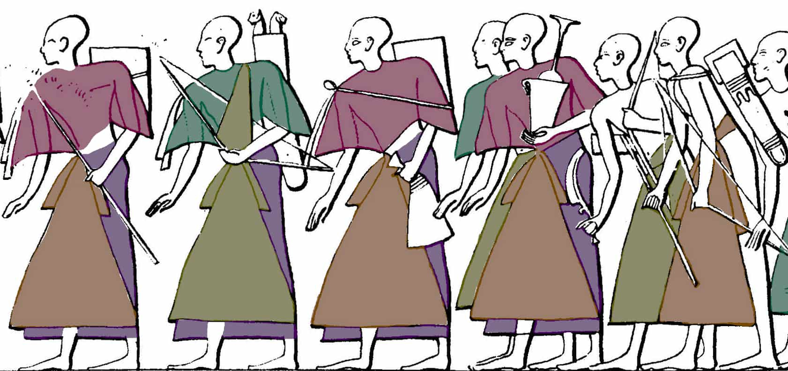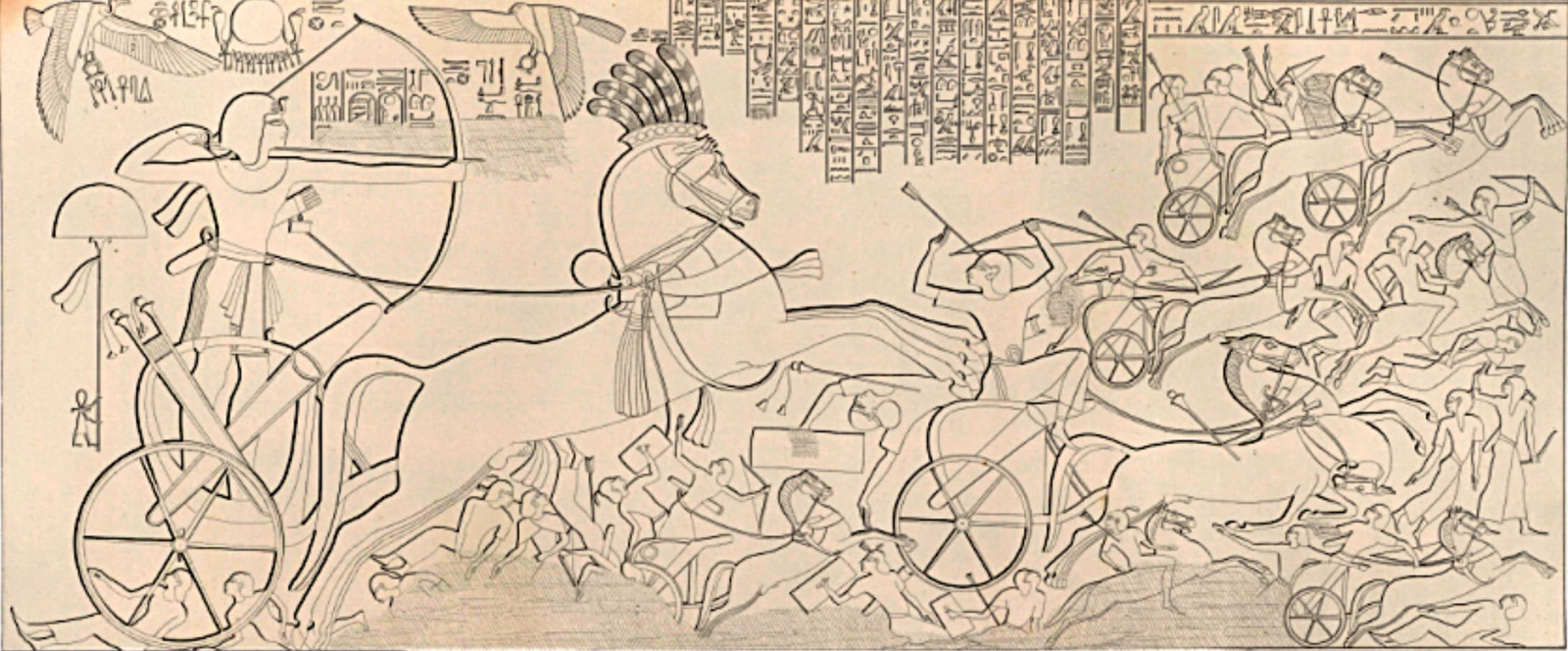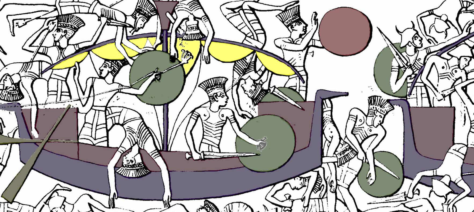 Esta imagen reproduce uno de los relieves históricos más célebres del Antiguo Egipto, conservado en el templo de Medinet Habu, en Tebas occidental. En él se representa la victoria de Ramsés III frente a los Pueblos del Mar, una confederación de grupos procedentes del Mediterráneo oriental que, hacia el siglo XII a. C., protagonizó movimientos migratorios, conflictos armados e invasiones que afectaron a numerosas civilizaciones de la época.