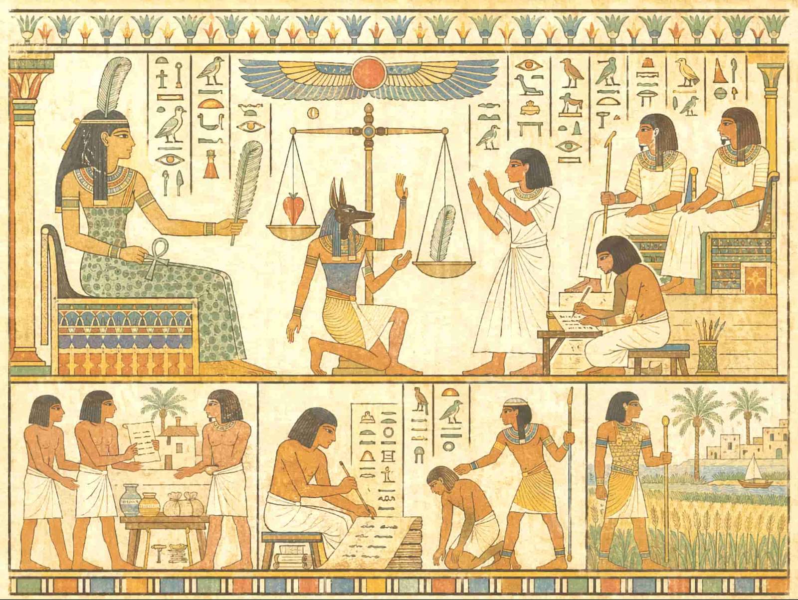 La religión ofrecía una dimensión aún más profunda de ese equilibrio. La maat, entendida como verdad, justicia, armonía y rectitud, actuaba como ideal rector. No era solo un concepto moral, sino una manera de imaginar el funcionamiento correcto del mundo. Gobernar bien, juzgar con justicia, respetar los ritos y asegurar la prosperidad eran expresiones distintas de una misma aspiración. En Egipto, el orden político y el orden cósmico se reflejaban mutuamente.