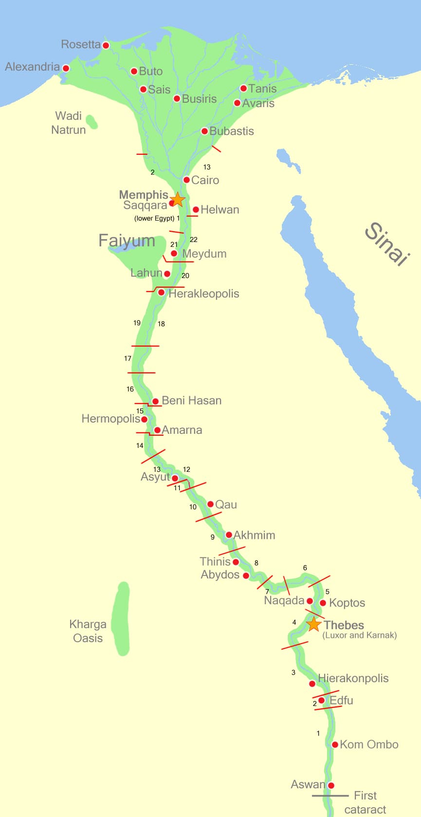 El mapa representa de forma sintética la geografía del antiguo Egipto y de sus áreas vecinas en una época faraónica amplia, combinando elementos de distintos periodos históricos. No corresponde a un solo año concreto, sino a una visión general del Egipto dinástico, cuando el valle del Nilo actuaba como eje político, económico y cultural de una de las civilizaciones más duraderas del mundo antiguo. El mapa muestra ciudades que tuvieron importancia en momentos diferentes, rutas de contacto, regiones naturales y territorios limítrofes como Sinaí, Nubia o Kush, lo que lo convierte en una herramienta útil para comprender la lógica espacial del poder egipcio.