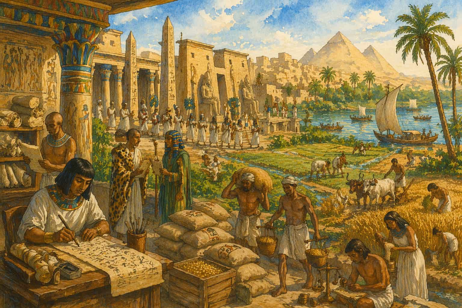 El Antiguo Egipto: administración, trabajo y civilización a orillas del Nilo. Escena idealizada de la vida en el Antiguo Egipto donde se integran agricultura, escritura, religión, comercio y organización social bajo el marco del valle del Nilo. La imagen ofrece una visión amplia del mundo egipcio más allá de la figura del faraón. En primer plano aparecen escribas y administradores, responsables de registrar impuestos, cosechas y recursos, recordando que Egipto fue también una civilización de archivos, cálculo y gestión. Junto a ellos, campesinos, cargadores y trabajadores muestran el esfuerzo cotidiano que sostenía la riqueza del país. Al fondo, templos, procesiones y monumentos evocan la dimensión religiosa y simbólica de una sociedad donde política y creencias estaban estrechamente unidas. El río Nilo atraviesa la escena como fuente de fertilidad, comunicación y cohesión territorial. En conjunto, la ilustración resume una idea esencial: el esplendor egipcio no dependió solo de sus grandes reyes o de sus monumentos, sino de una compleja organización humana capaz de coordinar trabajo, poder, recursos y tradición durante siglos.