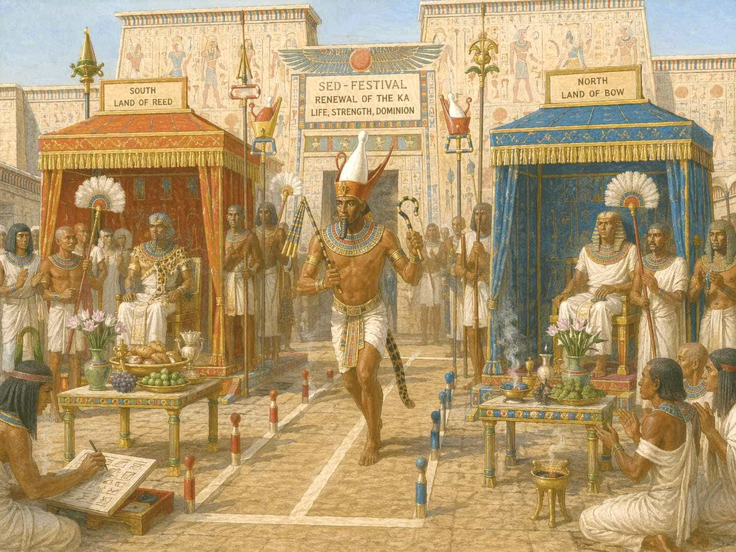 En ese entramado, el poder no se apoyaba únicamente en la fuerza. Se sostenía también en la religión, en la escritura, en el ritual y en la capacidad de convertir el dominio en una forma visible de verdad social. El faraón aparecía como soberano, pero también como figura sagrada; los templos eran lugares de culto, pero además centros económicos y políticos; los escribas registraban impuestos, censos y propiedades, pero al mismo tiempo encarnaban el prestigio del saber y del control administrativo. Todo estaba conectado. En Egipto, gobernar no significaba solo mandar: significaba mantener el orden del mundo, garantizar la fertilidad del país, hacer visible la autoridad y conservar un equilibrio siempre amenazado.
