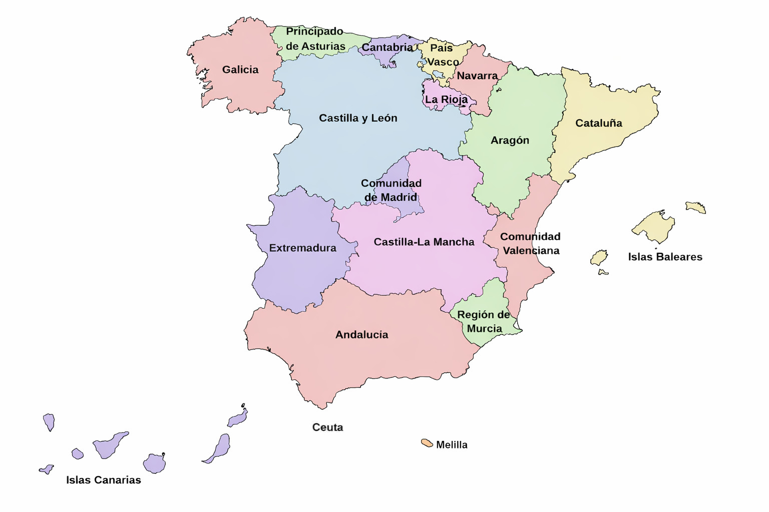 Visualizar las Comunidades Autónomas implica reconocer que España no es un bloque homogéneo. El mapa muestra regiones con realidades demográficas muy distintas: territorios densamente poblados como Andalucía o Cataluña, junto a regiones menos pobladas como La Rioja o Cantabria; extensiones geográficas amplias frente a otras más reducidas. También se ve la singularidad de las comunidades insulares —como las Islas Baleares y las Islas Canarias— que, por su carácter insular, enfrentan desafíos administrativos propios, o las ciudades de Ceuta y Melilla, espacios urbanos autónomos en un marco geográfico diferente.