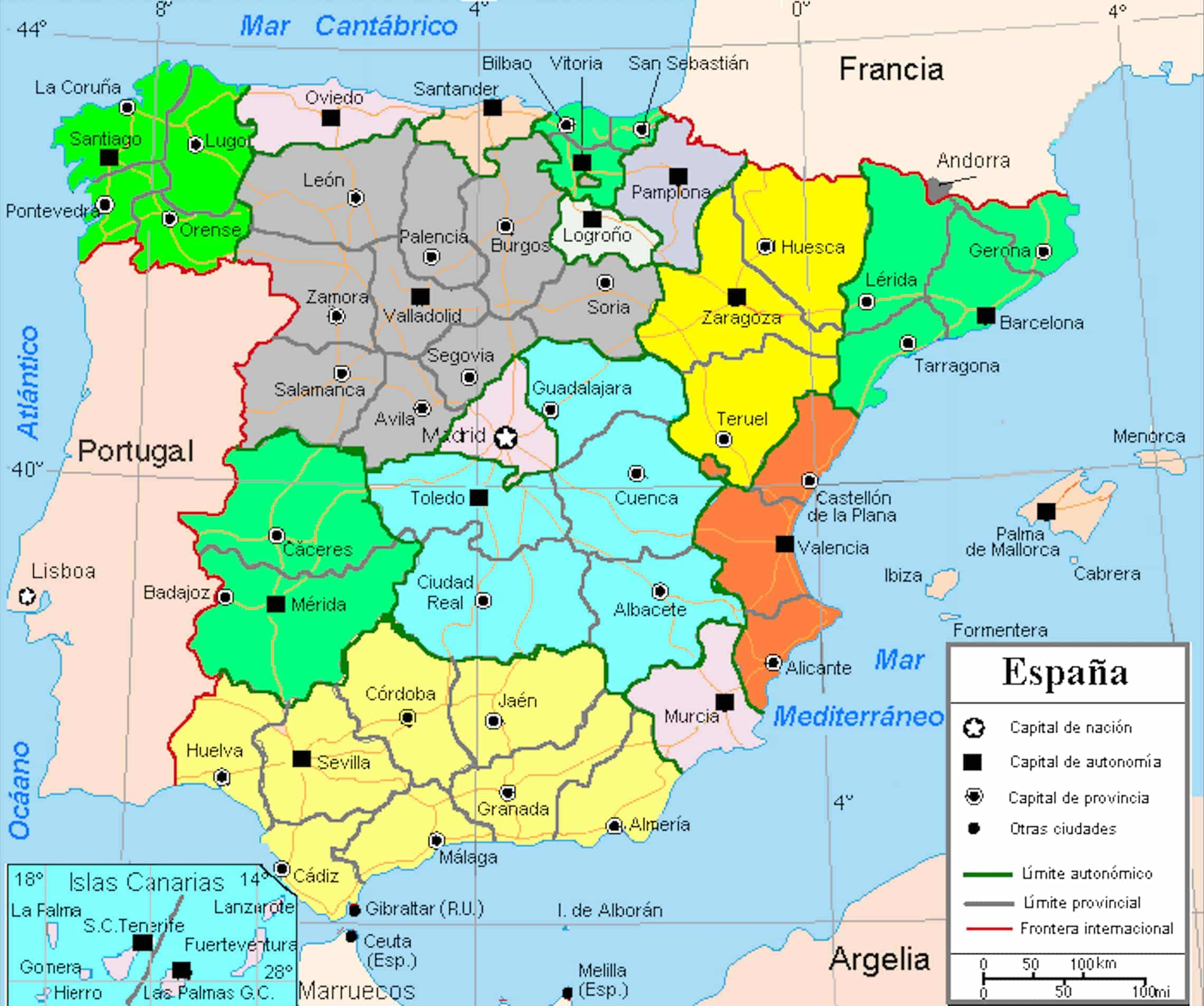Mapa político-administrativo de España con división en Comunidades Autónomas y provincias — Fuente: Wikipedia, dominio público. User: Gabri.