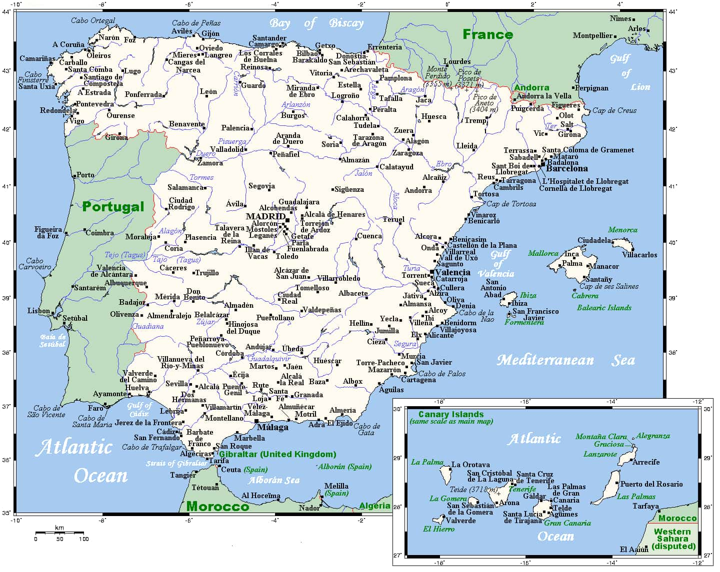 Mapa geográfico de España y su entorno regional, con principales ciudades, relieve y límites internacionales — Fuente: Wikipedia, dominio público. User: Kelisi at the English-language Wikipedia. CC BY-SA 3.0. Original file (1,440 × 1,145 pixels, file size: 143 KB).