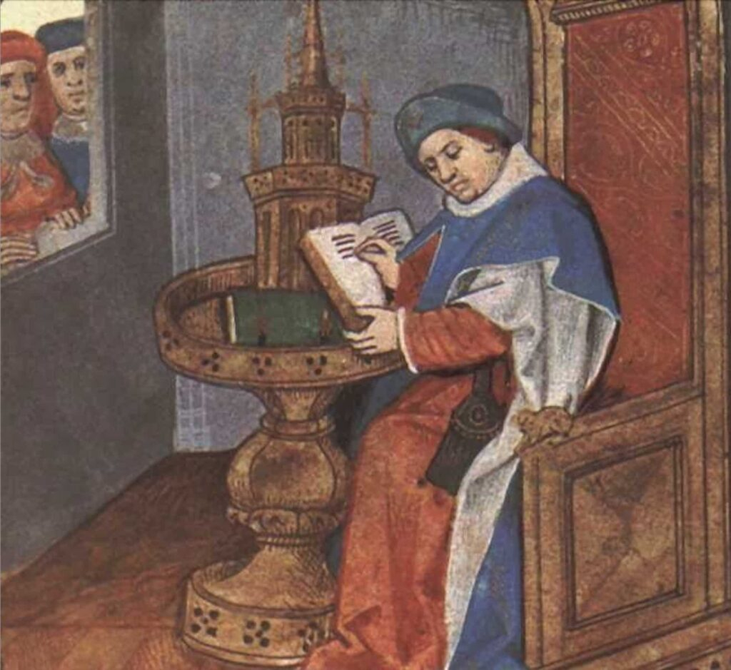 Al fondo, a través de una ventana, aparecen varias figuras que observan la escena. Su presencia añade una dimensión social a la imagen, recordando que la escritura medieval no era un acto solitario, sino una actividad que tenía siempre un destinatario. El escritor trabaja para un público que espera, escucha o lee su obra, y que participa de la transmisión cultural. La miniatura sugiere así el circuito completo de la literatura medieval: el proceso de creación, la copia manuscrita, la lectura y la difusión en un medio cortesano.