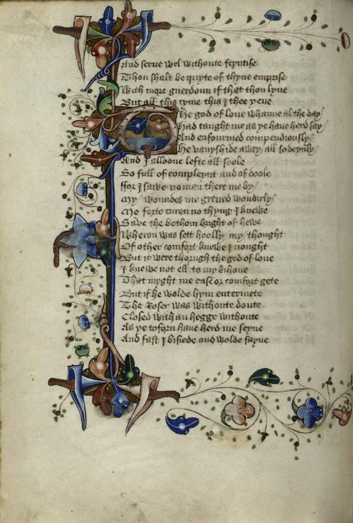 Esta página que compartimos pertenece a un manuscrito iluminado del Romaunt of the Rose, es decir, la traducción al inglés medio que Geoffrey Chaucer realizó del Roman de la Rose original francés. Se trata de un testimonio de enorme valor, porque refleja cómo esta obra fundamental de la literatura medieval traspasó fronteras lingüísticas y culturales, llegando a convertirse en un referente para la tradición literaria inglesa.