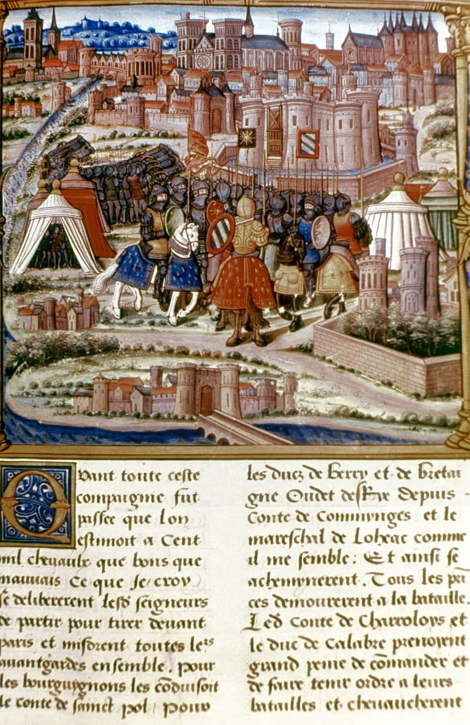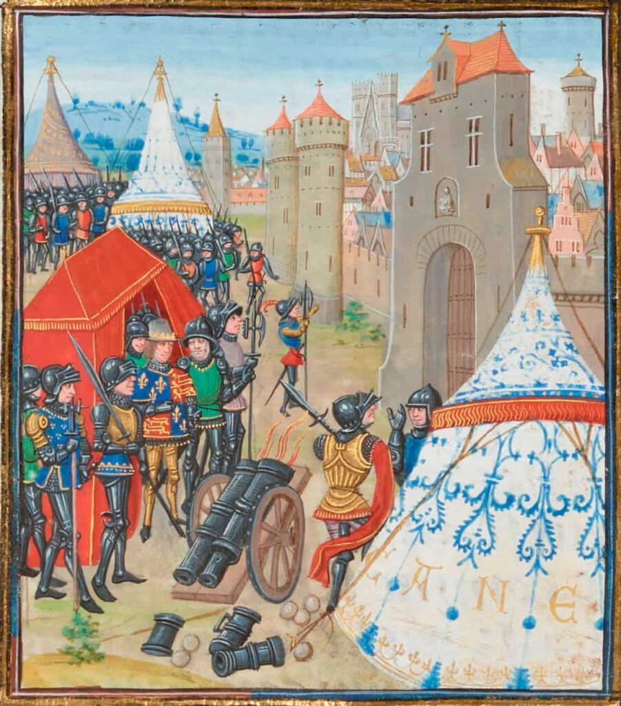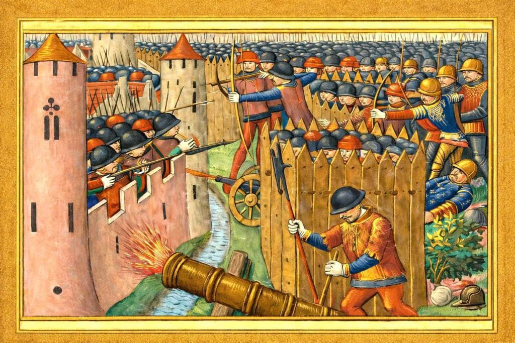 Asedio de Orleans (1428–1429) — Miniatura medieval del siglo XV. Escena de combate durante la fase crítica de la Guerra de los Cien Años, en la que las fuerzas inglesas sitiaron la ciudad francesa antes de la intervención decisiva de Juana de Arco. La imagen muestra el uso temprano de artillería, arqueros y defensas fortificadas, reflejando las transformaciones técnicas y militares del final de la Edad Media. Fuente: Manuscrito medieval, dominio público (Wikimedia Commons). Anónimo – Este archivo procede de la biblioteca digital Gallica,